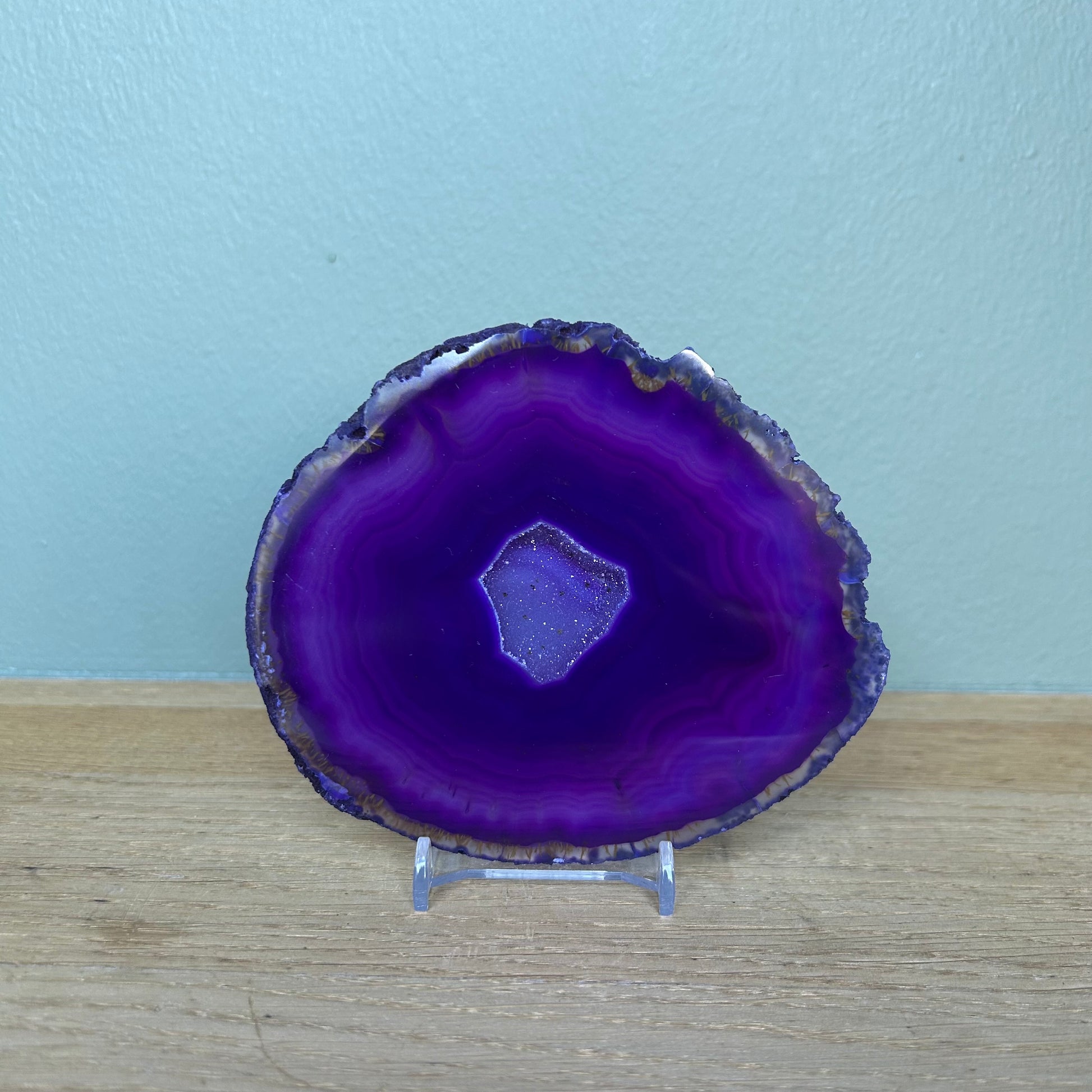 Bijgekleurde agaatschijf van ongeveer 10,5 bij 12 centimeter.