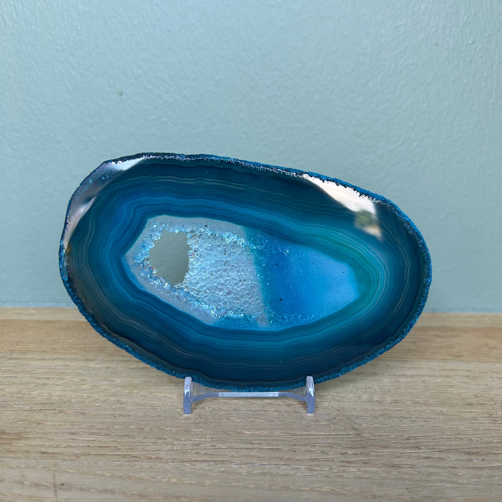 Bijgekleurde agaatschijf van ongeveer 9 bij 14 centimeter.
