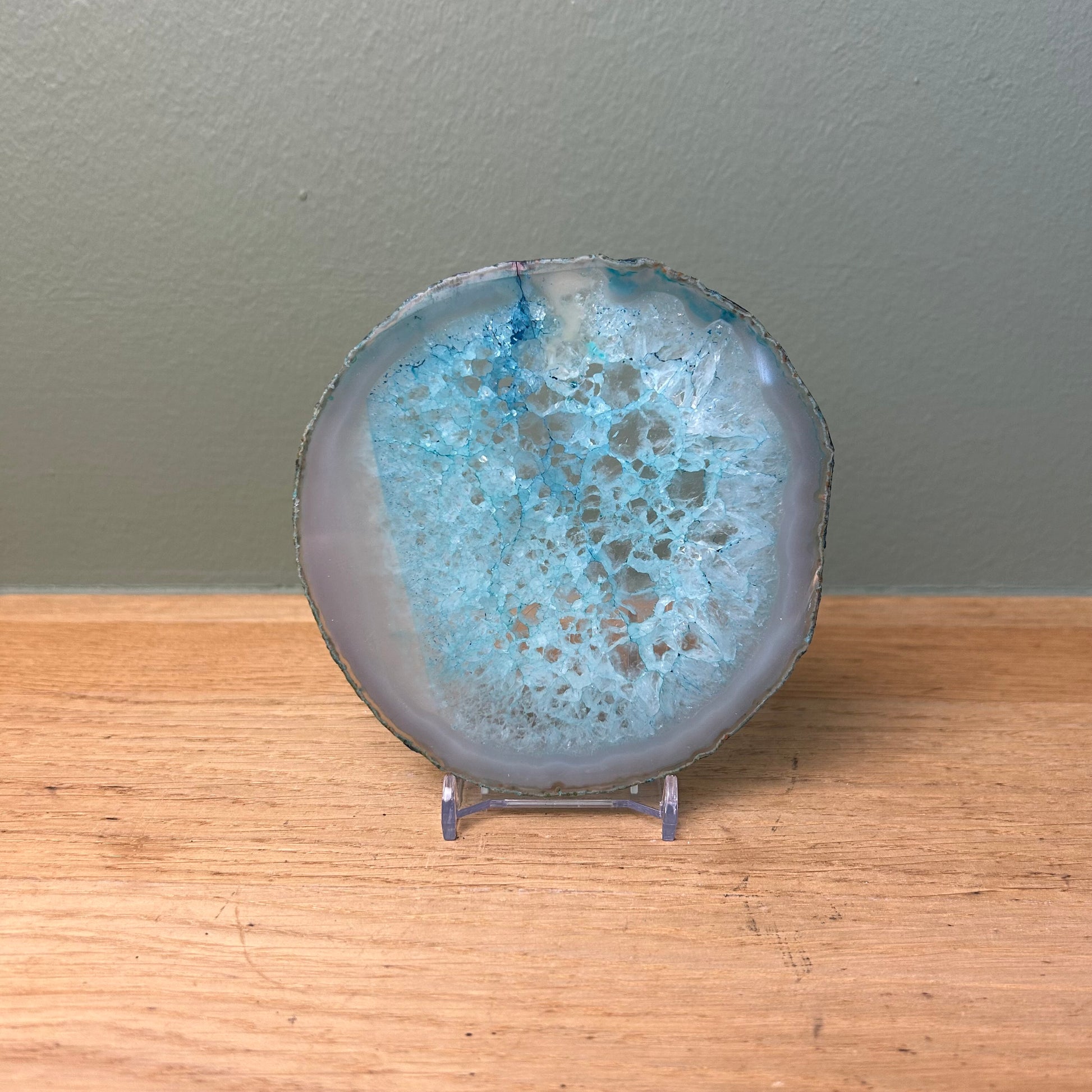 Bijgekleurde agaatschijf van ongeveer 11 bij 11 centimeter.