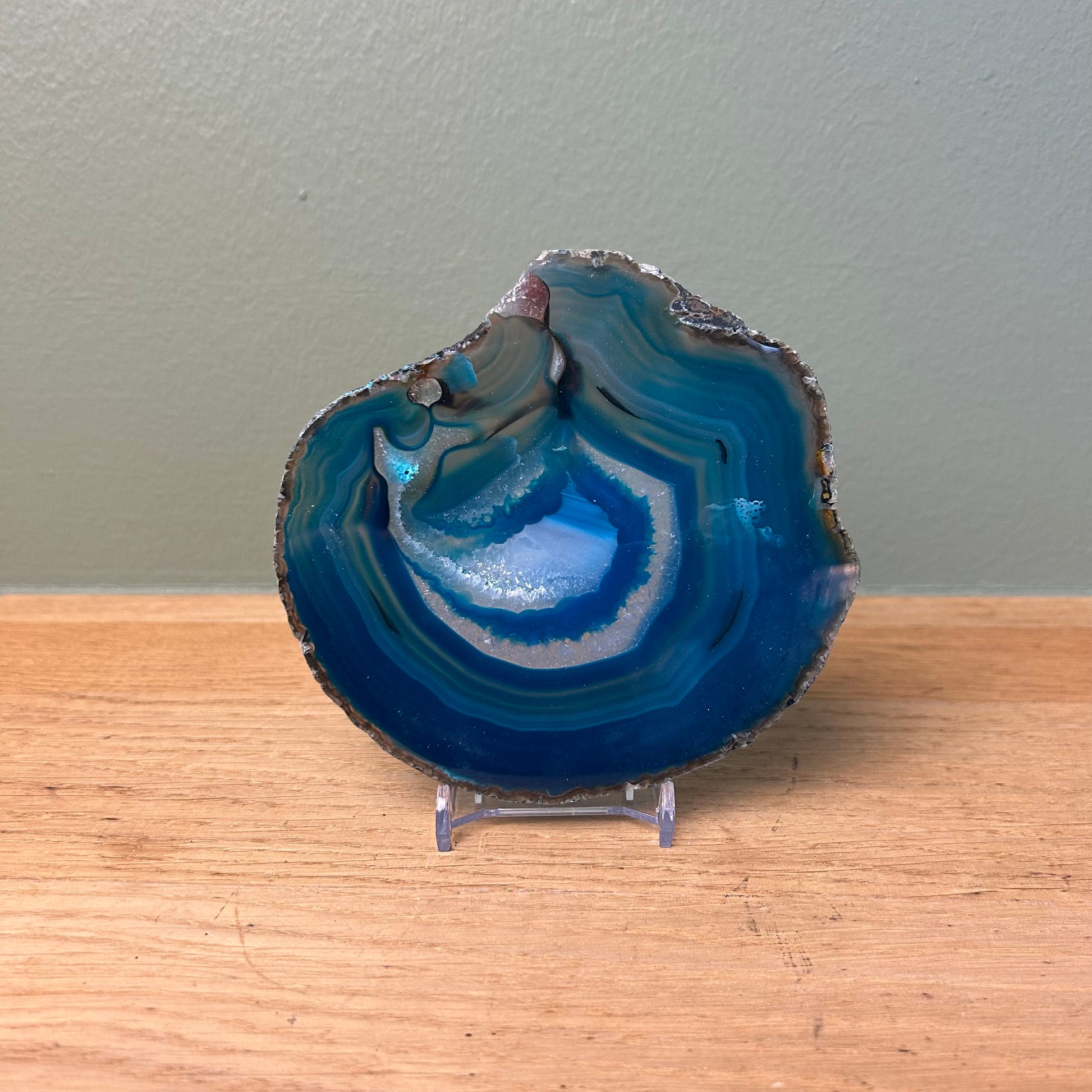Bijgekleurde agaatschijf van ongeveer 12 bij 10,5 centimeter.