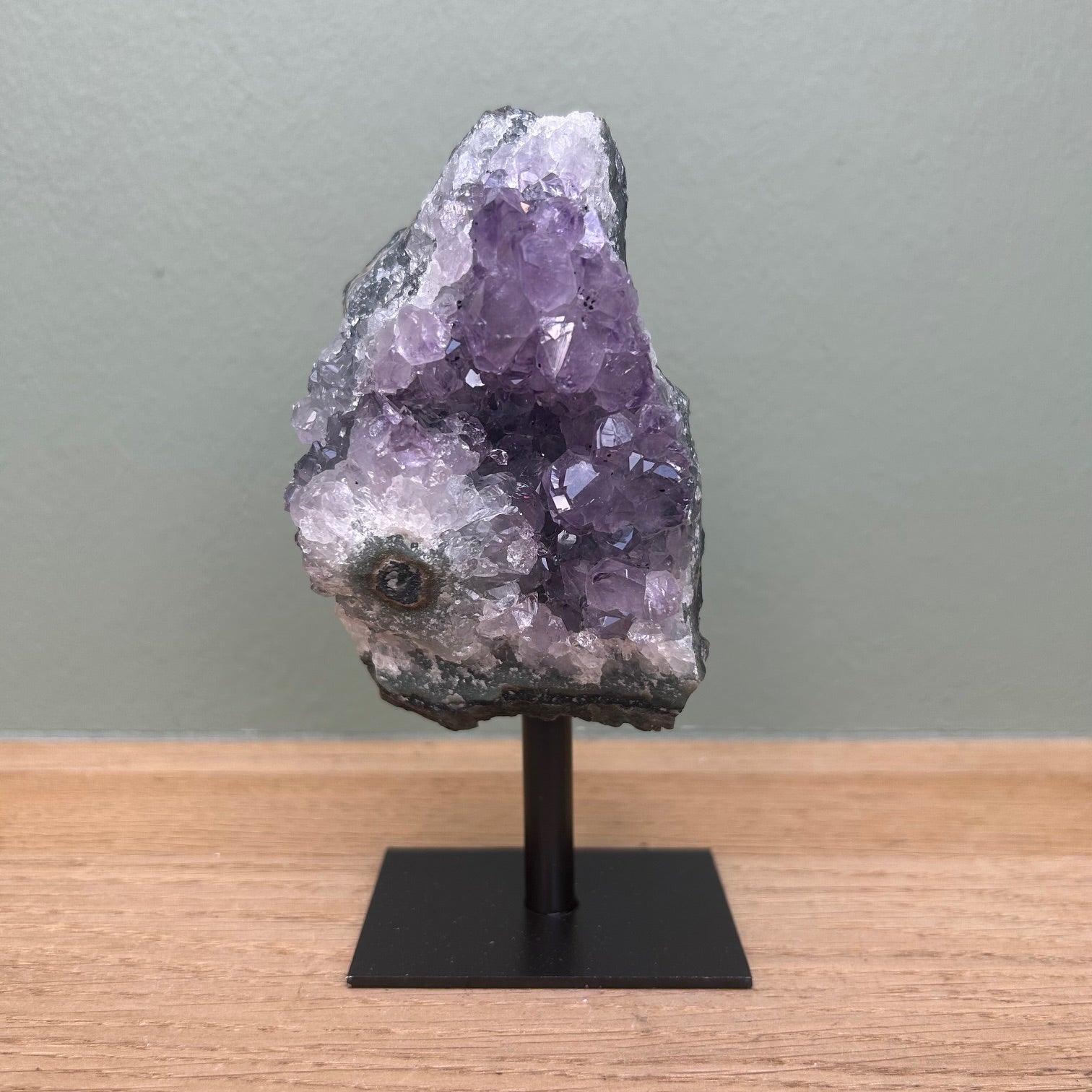 Amethist cluster op standaard van ongeveer 14,5 centimeter hoog.