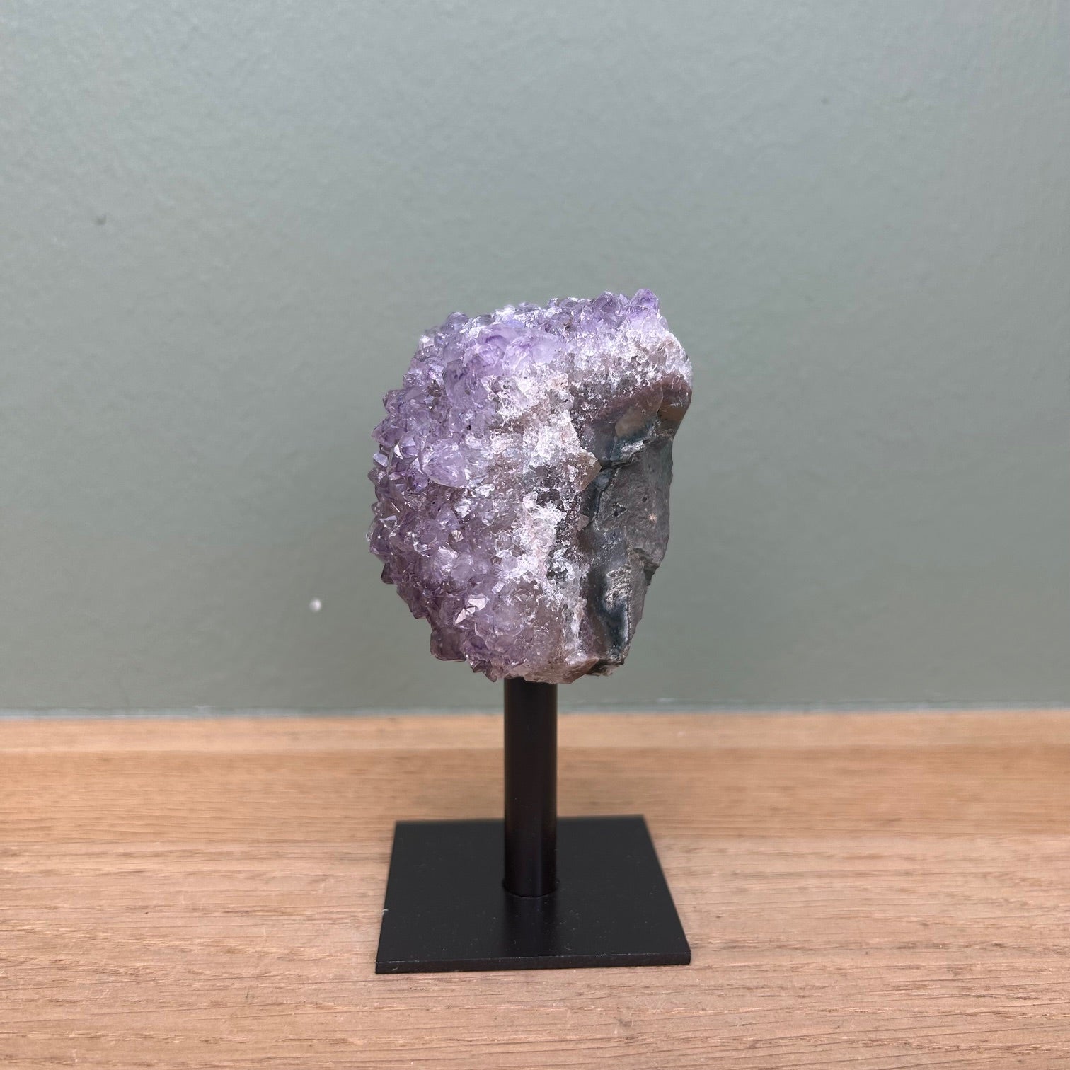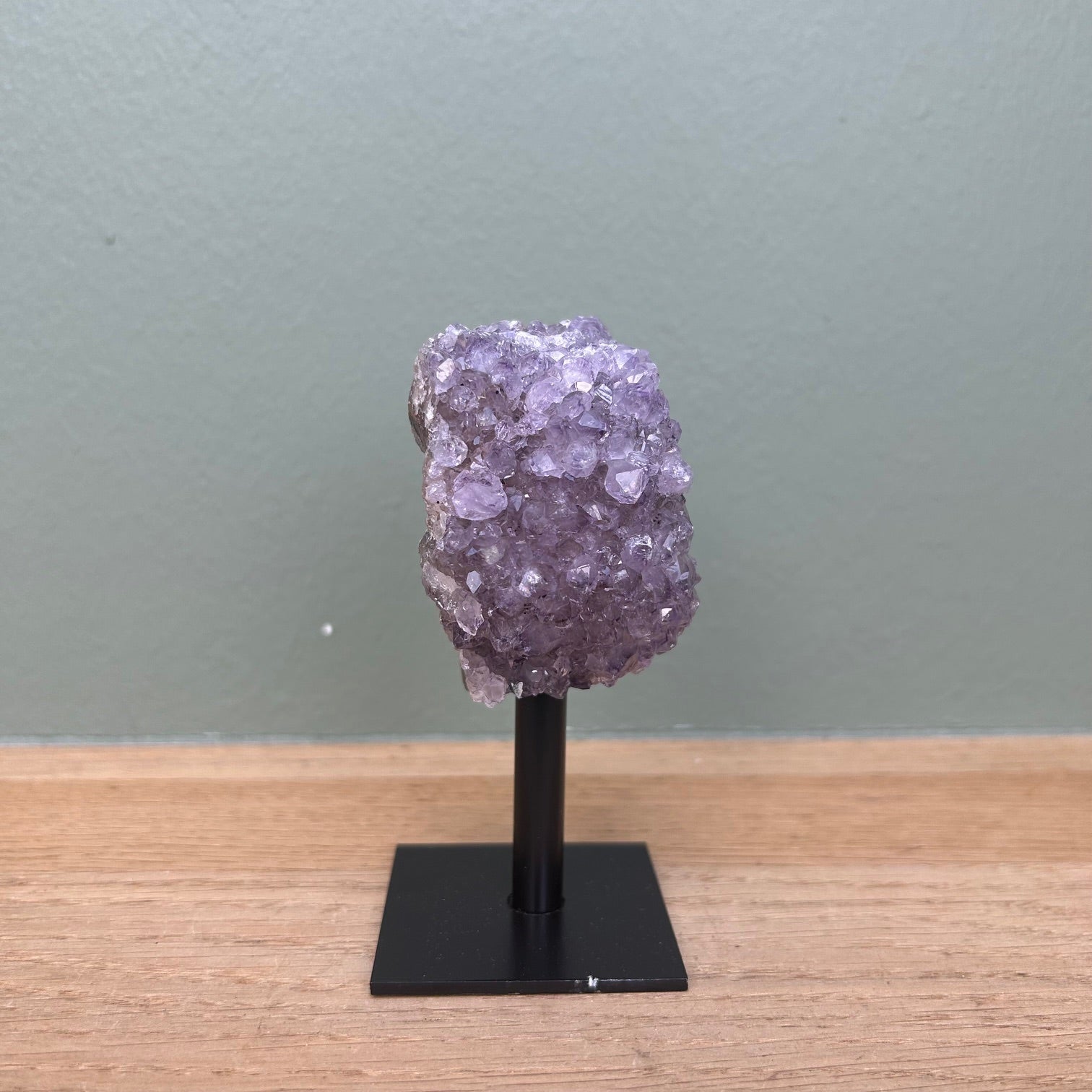 Amethist cluster op standaard van ongeveer 10,5 centimeter hoog.