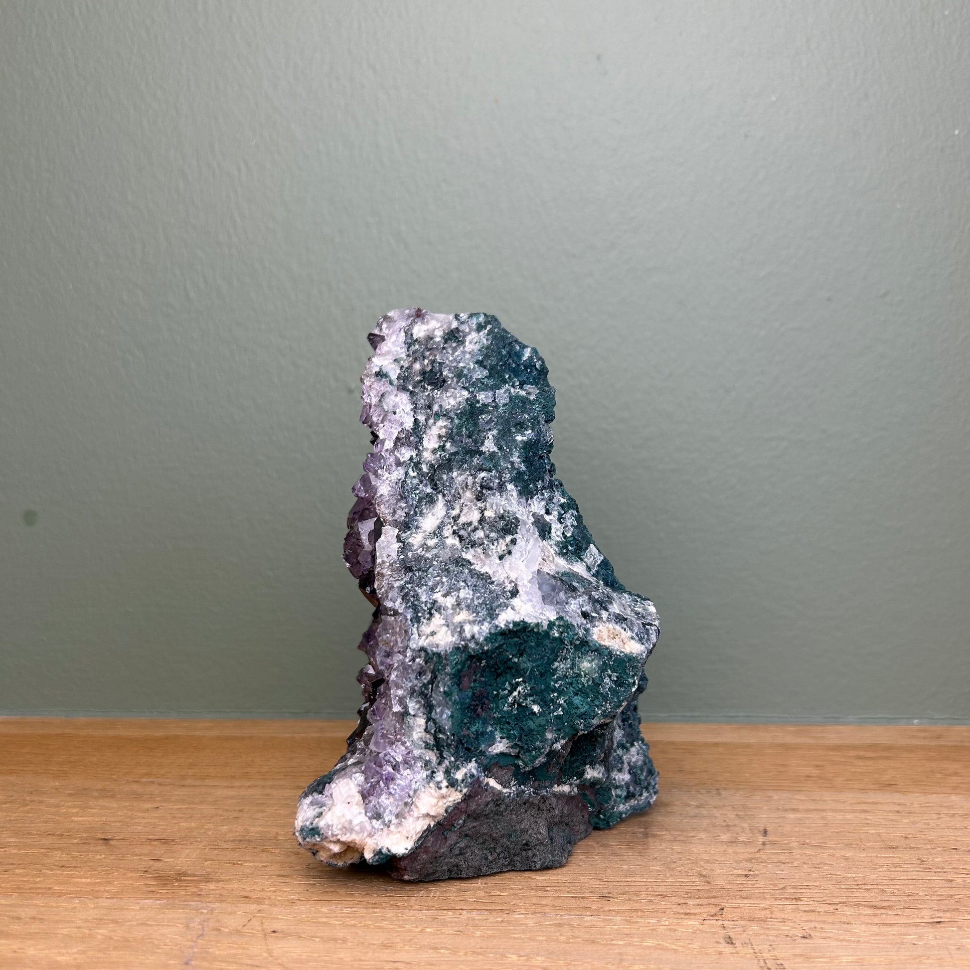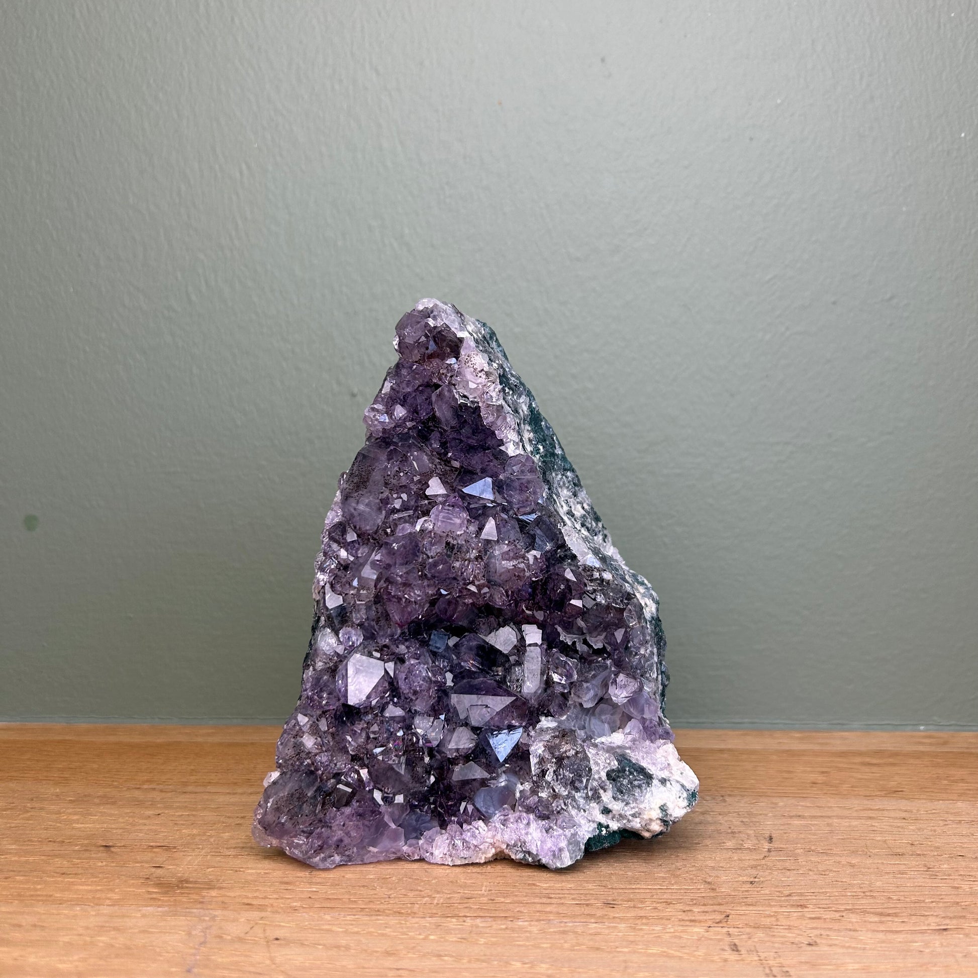 Amethist op standvlak van ongeveer 14 centimeter hoog.