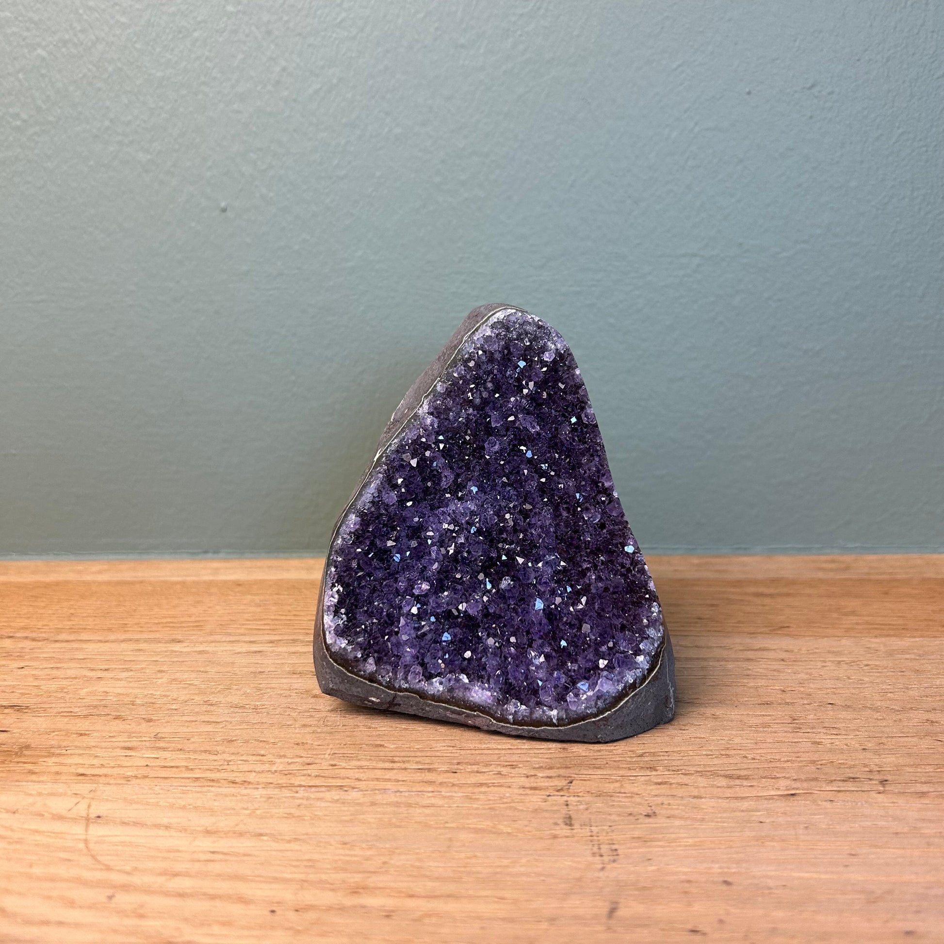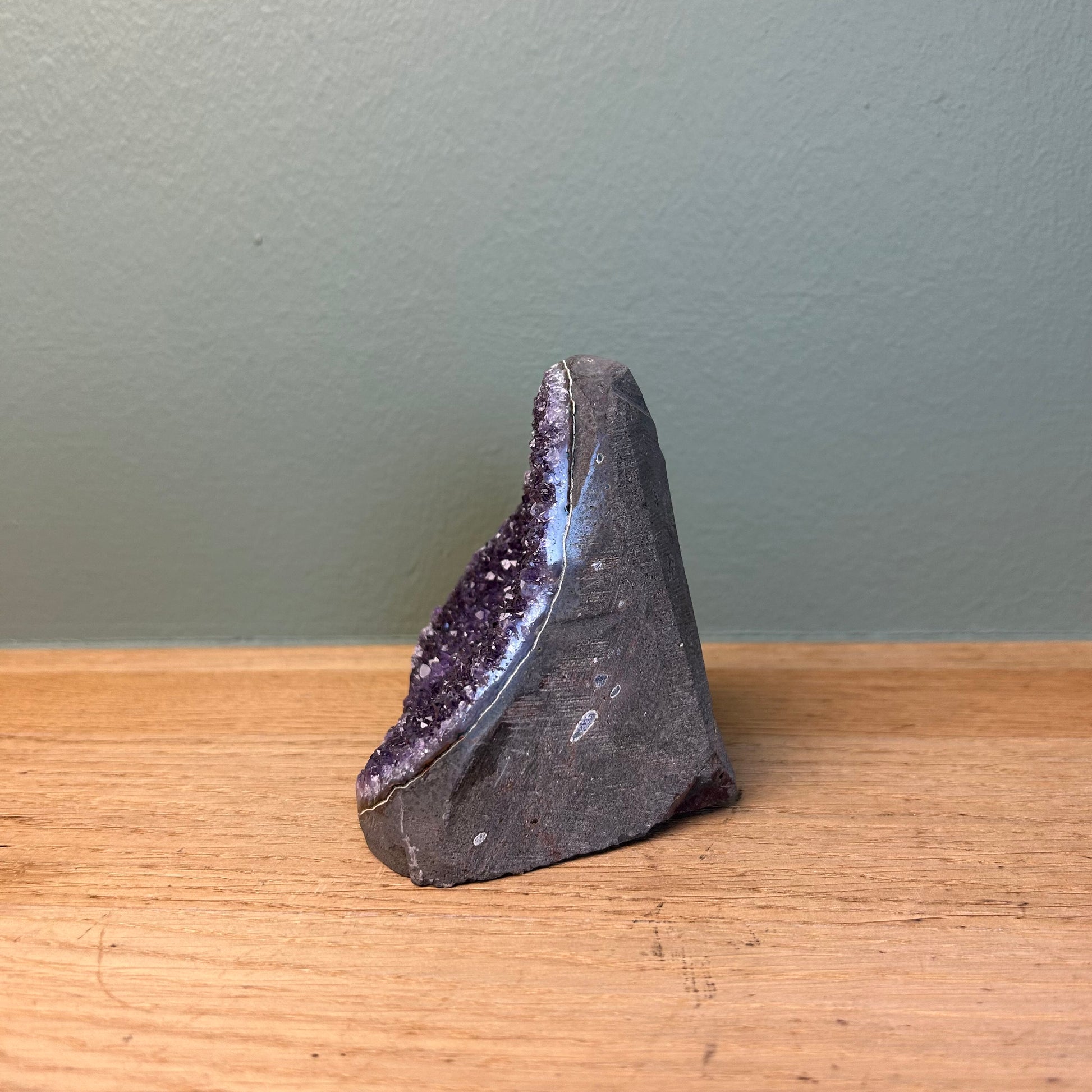 Amethist op standvlak van ongeveer 9 centimeter hoog.