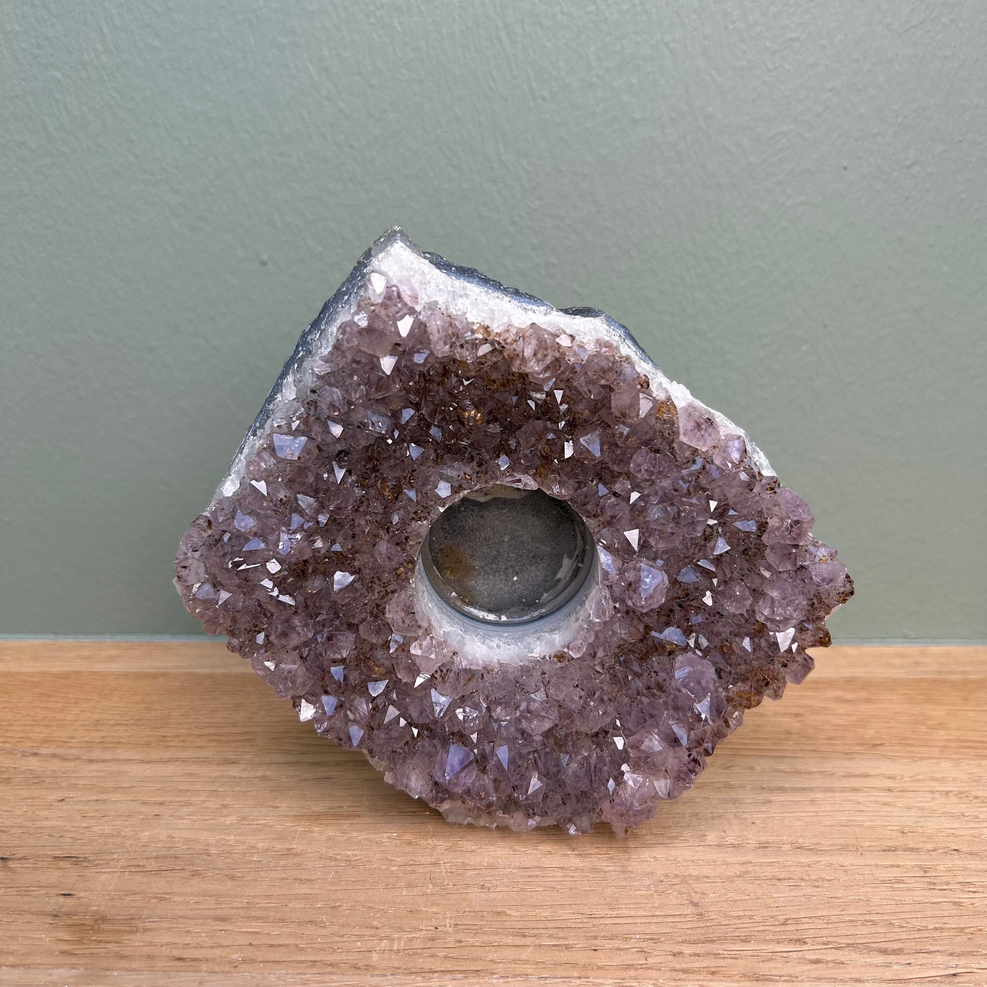 Waxine van amethist van ongeveer 13 bij 12 centimeter.