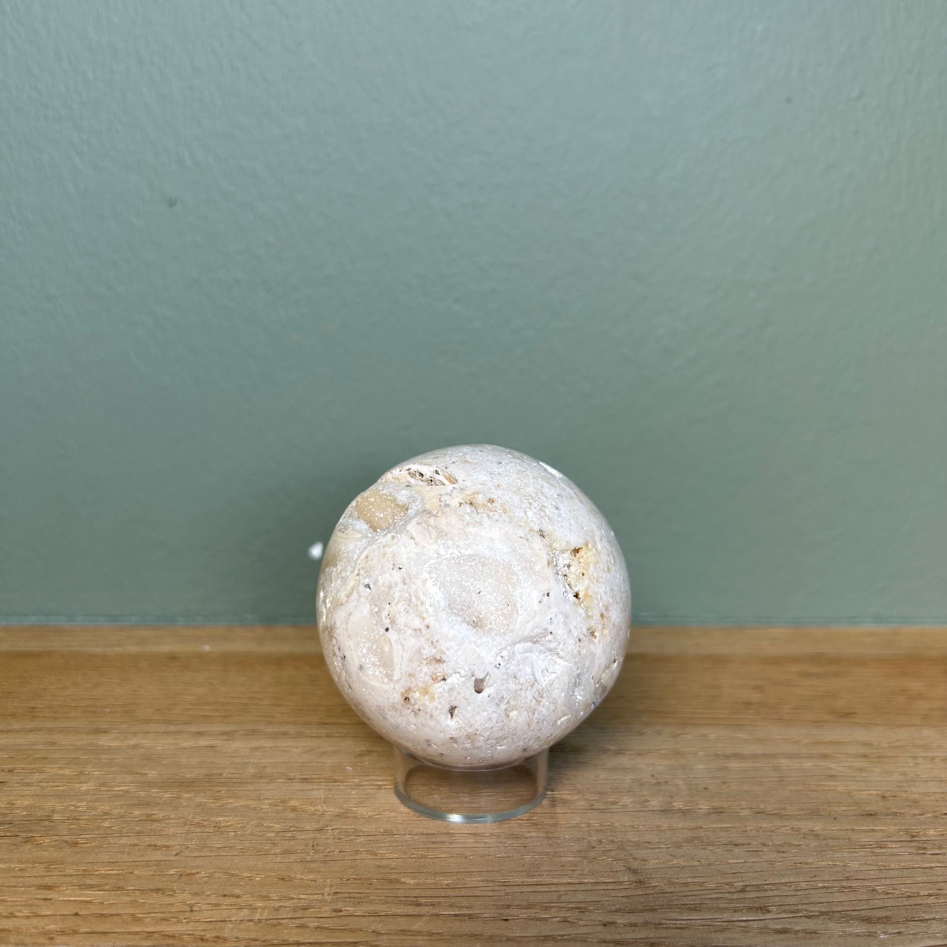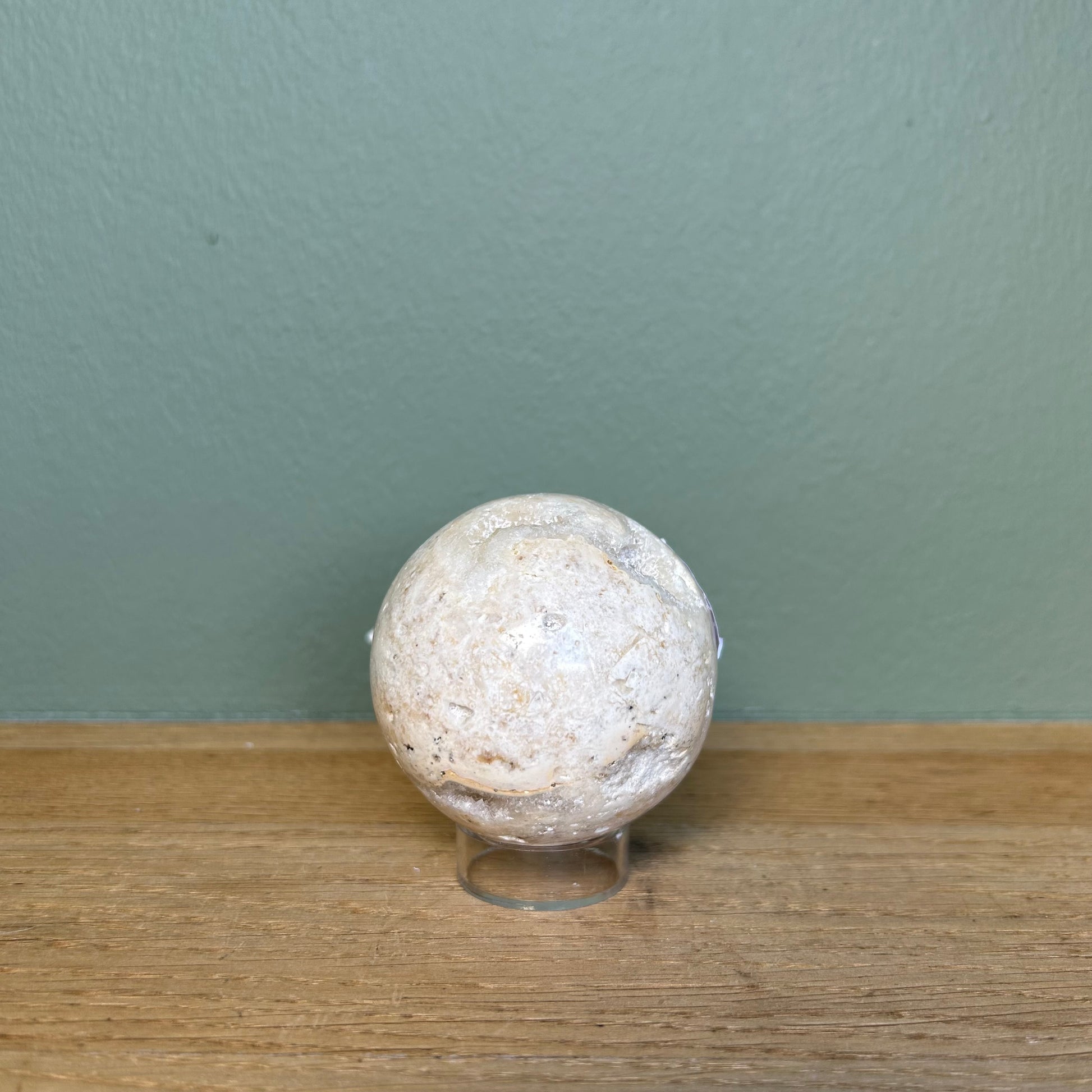 Bol van calciet met een diameter van ongeveer 6 centimeter.