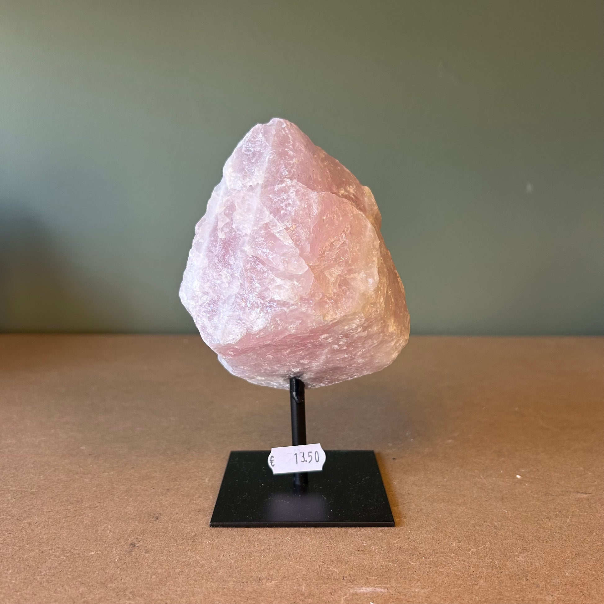 Ruw stuk rozenkwarts op standaard van 16 centimeter hoog.