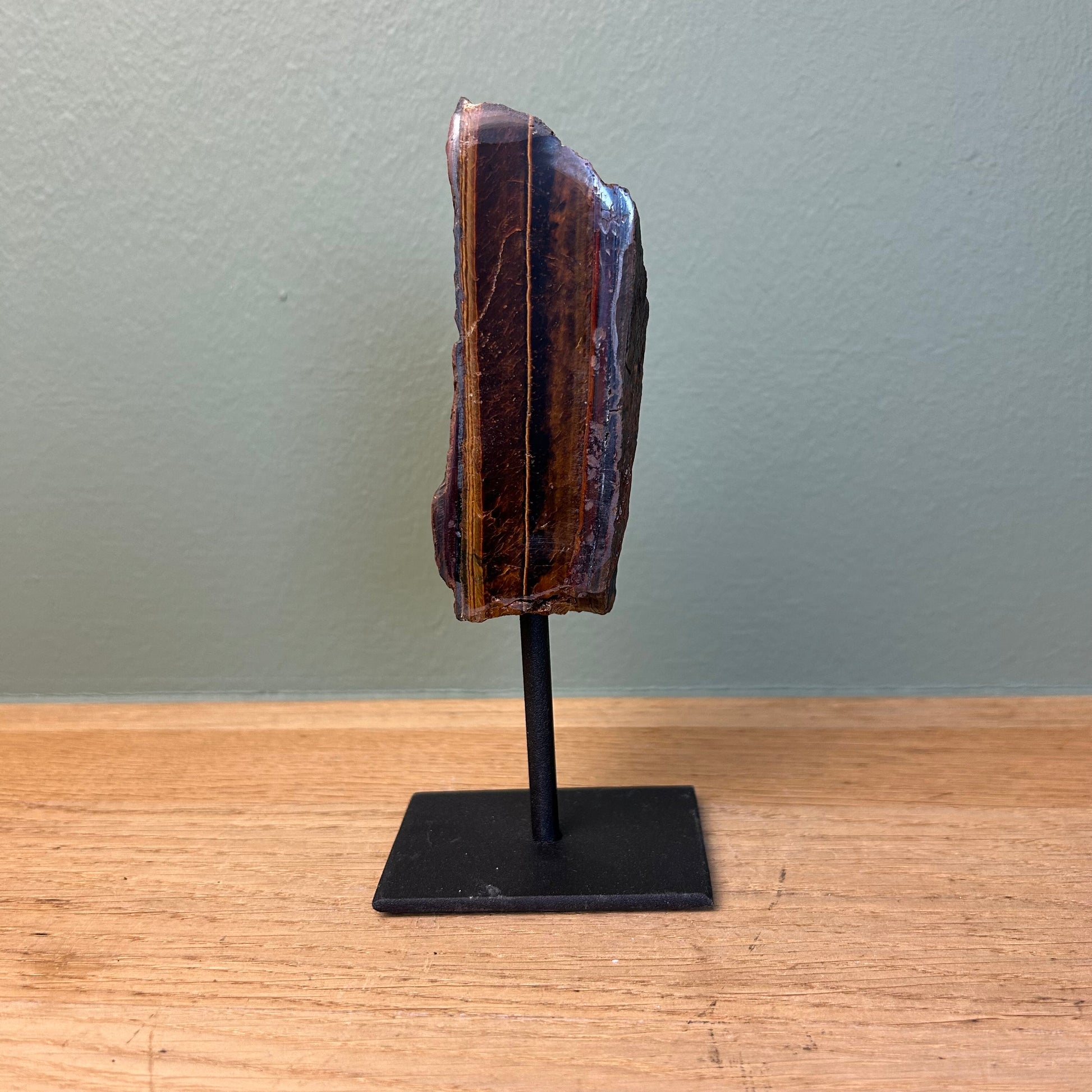 Half gepolijst stuk tijgeroog op standaard van 16 centimeter hoog.